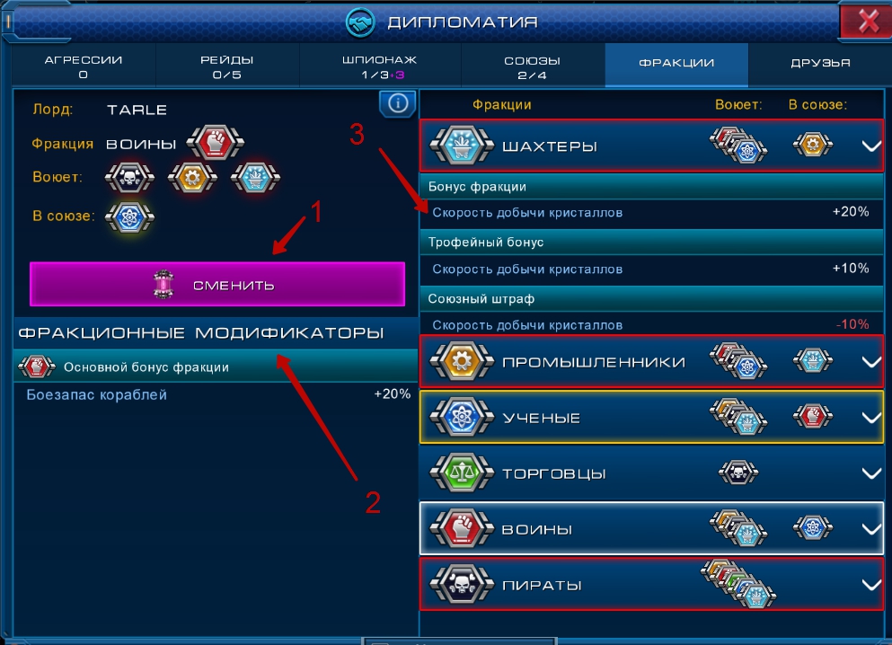 Если кратко о Фракциях: они дают нам бонус, например, у Ученых - ускорение Науки. Плюшка вкусная, конечно. Но! Потерять бонус Фракции - проще простого! Как и получить штрафной бонус от союзной Фракции. Внимательно смотрите кого атакуете - если игрок принадлежит союзной Фракции - то вы получите штраф. Если игрок принадлежит к вражеской Фракции - то вы получите бонус от победы над ним.