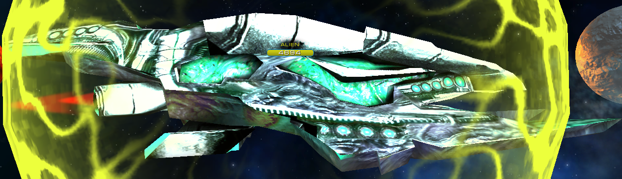 Это такой минибоссик, который встречается на Антиплутонах, а также в одноименном квесте. Постоянно куда то телепортируется, лечит союзные корабли, стреляет Ежами и другими неприятностями… При попадании по нему любым боеприпасом его Щит и прочность только увеличиваются. Убить НЛО можно исключительно Проникающими лазерами и, как это ни странно, Ремонтными лучами.